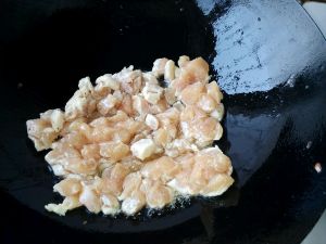 倒入腌制好的鸡脯肉,继续滑炒,大火,由于有淀粉,速度要快,以免粘锅