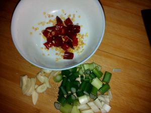 加入切好的葱花和拍碎的蒜粒,继续翻炒