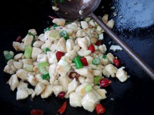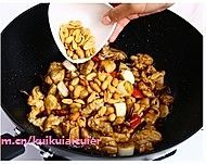加入鸡丁、葱白丝、撒上花生碎和干辣椒