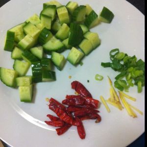 准备黄瓜丁,胡萝卜丁,葱,姜,蒜,干辣椒