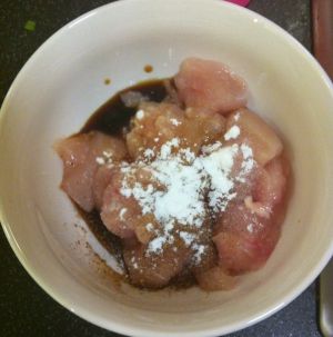 鸡胸脯肉切成丁 用料酒 盐 胡椒粉抓匀 然后加一点蛋清抓匀 放入淀粉进去再搅拌 最后淋入一点油腌制一段时间