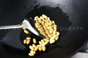 取炒锅,放少许油烧热,下花生米炒至酥脆变色放置一旁备用;