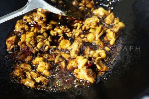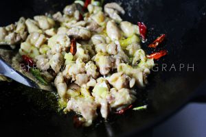 放入油,干辣椒,花椒,小火炸几分钟,放入葱姜蒜翻炒,再放入腌制的鸡肉大火翻炒,最后放入胡萝卜和黄瓜丁翻炒,倒入调制好的汤汁。翻炒,出锅。