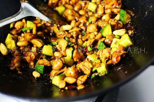 下黄瓜丁、剩下的葱丝、煸好的花生米炒匀后略微收汁即可。