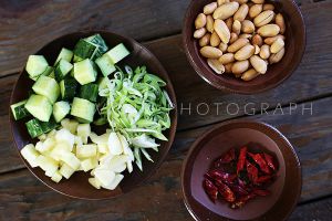 葱切丝,蒜瓣切片,嫩姜去皮切小粒,干辣椒切段,黄瓜切丁备用;