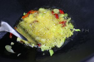再烧热适量油,下姜蒜、部分葱煸香,接着下干辣椒段,花椒翻炒;
