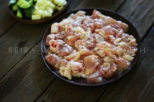 鸡胸肉切成1cm左右的方块,沥水,放入蒜泥,胡椒粉,料酒,盐少许腌制半小时以上