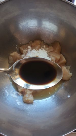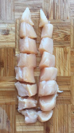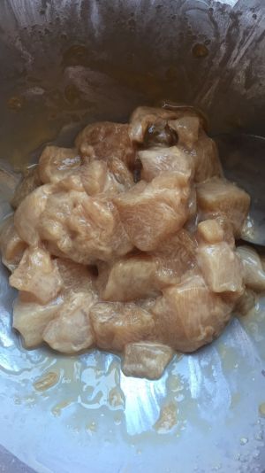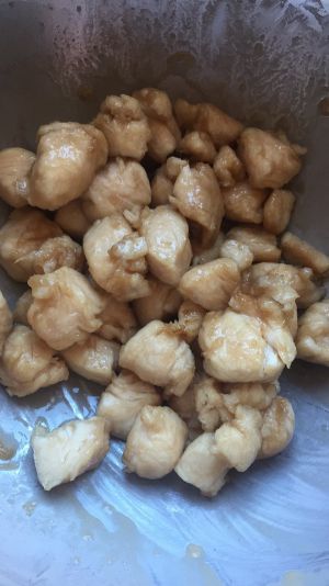 改刀成方块,略比鸡丁大一点点。装盘备用。