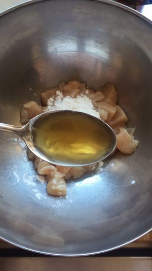 锅内倒入油适量,用于滑炒鸡丁和青椒(用量比炒菜的底油要多)