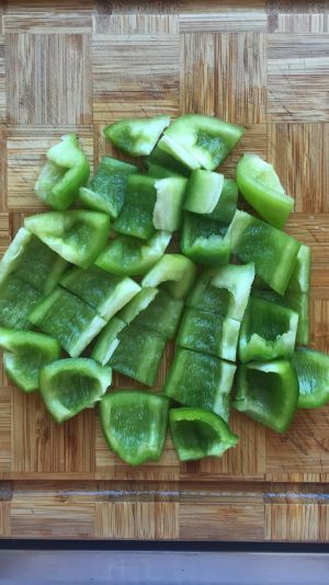 冷油下鸡丁翻炒,在油慢慢变热的同时,滑熟至肉质从粉色变为米黄色,即为八分熟,捞出备用。然后热油中下入切好的甜辣椒丁,翻炒几下断生,捞出备用。