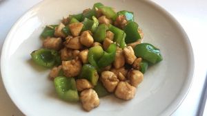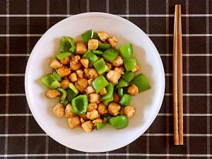 锅内留底油,大火下入蒜末爆香。下入过完油的鸡丁和青椒丁,翻炒几下至均匀。调小火,加入一大勺生抽、适量盐,调大火翻炒入味,即可关火装盘。