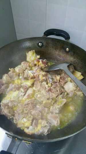 锅里倒油!油要多些!小火慢炸!将鸡肉炸7成熟捞出备用!我炸的比较干