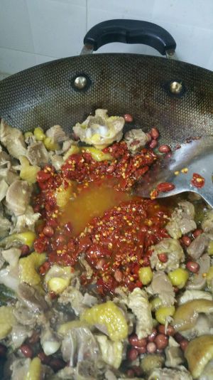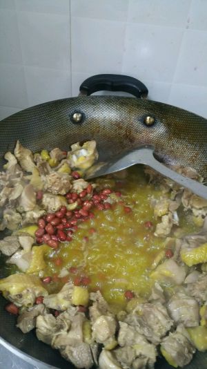待鸡块炒黄,出香味,大概六成熟的时侯,将鸡块赶到锅边,倒入花生米炸三分钟左右。