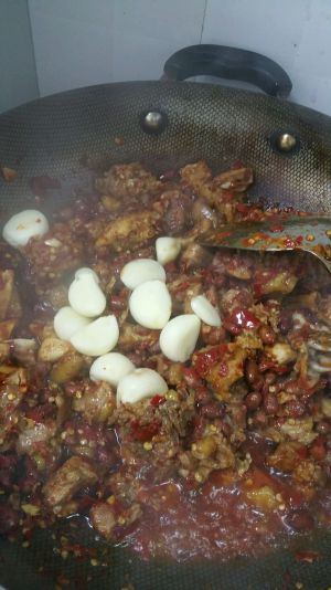 加入大蒜瓣,花椒粒,料酒,食盐进行翻炒至鸡块孰透。