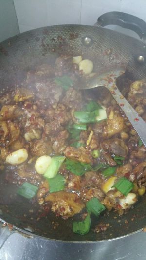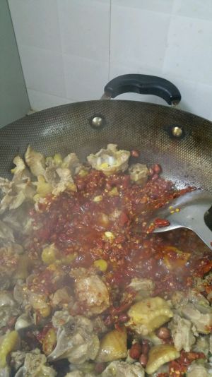 放入葱,姜,八角,花椒,辣椒爆炒!倒入鸡肉翻炒少放点生抽还有盐即可!这个过程时间较短