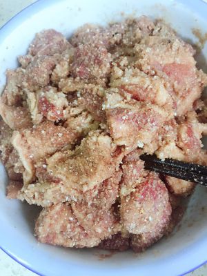 猪肉和排骨切成适口大小,放自制辣椒酱、白酒、酱油、一点点盐,搅拌均匀,腌制半小时左右。