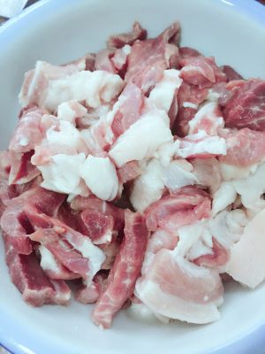三线肉切薄片,比回锅肉稍厚。加料酒,花椒,生抽,盐,糖腌1个小时。挑出花椒,加入蒸肉粉,使其完全包裹肉片。
