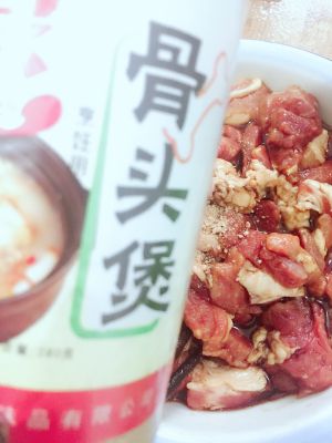 切好的五花肉加料酒,老抽,生抽,骨头煲粉搅拌均匀,腌制两小时(骨头煲粉是为了提味)