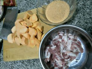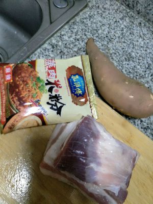 我买的五花肉比较肥 差点一斤 红薯两个小的 孔师傅蒸肉米粉一包(个人觉得孔师傅牌子的要好吃点 随便那种都行 有的喜欢其他牌子 超市都有卖 麻辣的更好吃 有五香的 )