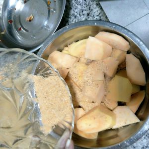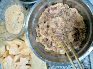 五花肉丁中放入蒸肉粉、白酒、生抽、适量水混合均匀,水的作用是把蒸肉粉打湿,使其粘在肉上,湿度建议大点,太干的肉蒸出来不好吃。 山药切丁放入碗底,适量撒点盐。