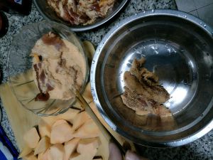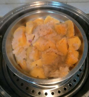 腌好的五花肉每片都裹上一层蒸肉粉,然后肉皮朝上(我好象码反了)码在土豆片上,将剩余的腌渍汤也倒在上面,上蒸锅蒸30~40分钟。