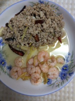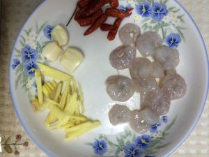 虾仁去皮去筋洗净、生姜丝、蒜、辣椒备好