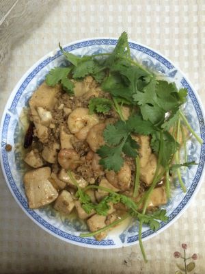 将肉末中倒入猪肉酱、盐、酱油腌制倒入油锅翻炒—倒入沥干的豆腐继续翻炒(中火)—加入适量生粉勾芡的汤汁和1茶匙盐继续翻炒—加入虾仁、酱油—盖锅盖—出锅装盘撒上香菜。