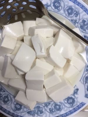 锅内放水,嫩豆腐切块倒入,烧开后捞出沥干备用。