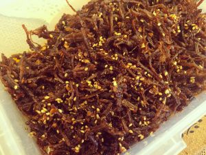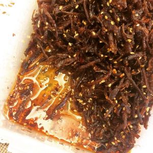 最后撒上熟芝麻拌匀就可以出锅啦!尝了一下,真的好吃哭!完全不输专业的包装食品!我直接装进了保鲜盒保存。