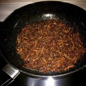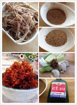 将肉丝成丝,去掉筋膜,锅里导入油,放入麻椒辣椒,油开肉丝放进去煸炒,导入酱油老抽糖,翻炒到肉丝成干。忘了照抄肉丝的照片