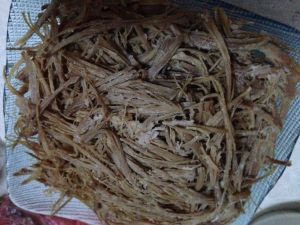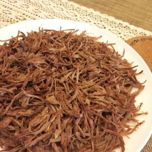 把肉放进清水里加入料酒,老抽,老姜煮1个小时,捞出过冷水,手撕(或者牙签)弄成这样的细丝。