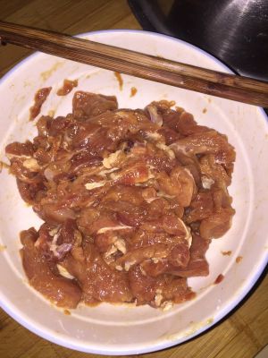 瘦肉也行,我买的里脊肉,比较嫩,切薄片,放入碗中,加淀粉,加鸡精,用手搅拌均匀,放进冰箱备用