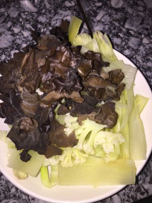 青笋去皮切薄片,有机菜花切成小块,木耳去根撕成小块