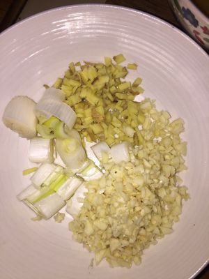 姜切成小沫,蒜切成小沫,葱段,以备炒汤料使用