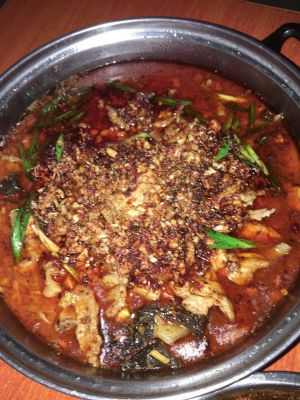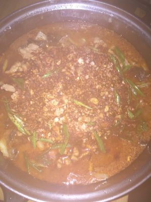 表面撒上蒜末,辣子面,切好的蒜苗摆开,烧油至热泼进去,听见滋滋的声音,就完成了,煮汤时候为了避免豆瓣酱过于咸,放入半勺鸡精,半勺糖,味道适中,
