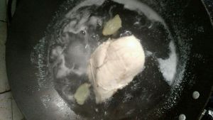 鸡胸肉,加几块姜片去腥,放入锅中,煮出浮沫,用锅铲压几下,不那么有弹性,就差不多可以捞出来了。冲冷水,放凉