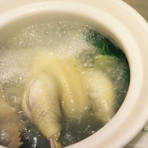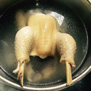 1 . 三黄鸡洗净,把鸡脖子,鸡头,鸡爪剁下备用,鸡屁股扔掉。然后用盐把鸡身搓一遍,放置10-15分钟。 2 .用一个比较深的煲烧水(水量:可以把鸡给完全浸泡)。水开后,放入3-4片姜(材料里忘写了),3-4颗葱达成葱结放入,然后把鸡放进开水里,中火12-15分钟(时间根据鸡的大小)。