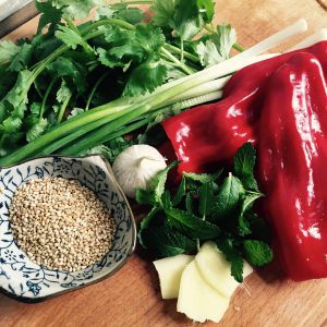 5. 芝麻热锅小火炒30秒,出锅。姜蒜剁茸,红椒切丝,葱和香菜切碎备用。 然后把姜蒜蓉,芝麻、红椒置小碗中,烧一点花生油,浇上去。