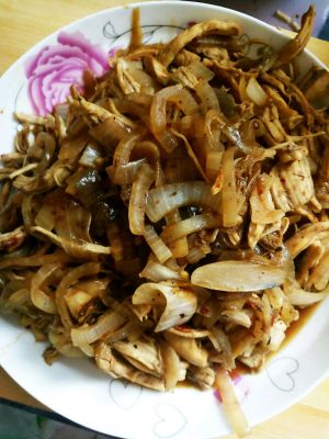 洋葱缩水后,放一点盐,腌制好的鸡胸肉下锅。翻炒至洋葱全熟,再翻炒一会,适量食盐调味,出锅装盘