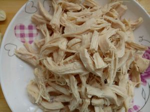 鸡肉撕成丝,用鸡壳上面的肉就好,腿啊翅啊可以先撕下来慢慢啃,嘿嘿!
