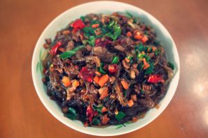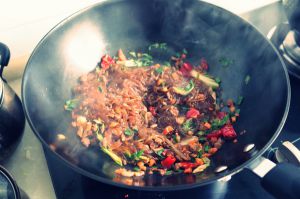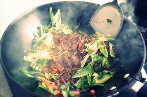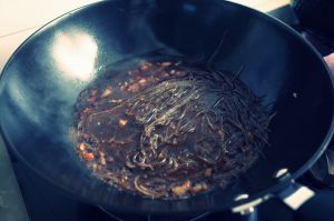 倒入之前备好的粉丝翻炒,因为过了凉水,就不容易坨在一起啦~ 加入少许生抽,一碗水,继续翻炒~