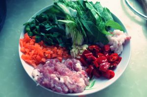 胡萝卜、大蒜叶、五花肉、泡椒、青菜切丁~姜切小丁;