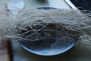 两团粉丝,沸水泡三至五分钟(包装袋后面这么写的,具体时间看你们买的粉丝哦)捞出凉水泡一下,沥干备用。