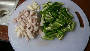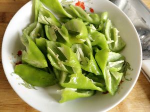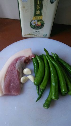 肉切片(要切成肥中带瘦的),不要切成,肥的肥,瘦的瘦。辣椒切条,这样方便吸收油脂。