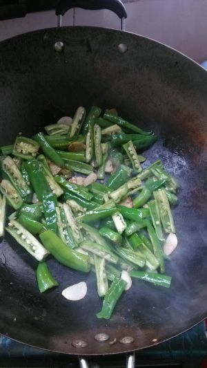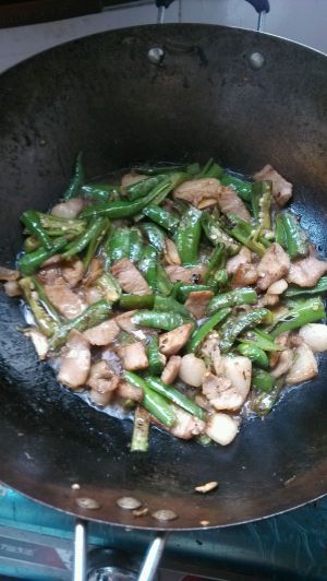 肉捞起,锅内留一些油,放入蒜仁,辣椒翻炒。