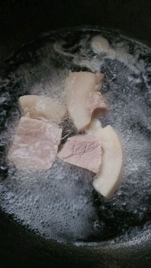 五花肉洗净冷水下锅焯水。直到一根筷子可以直接插到底。