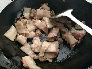 起油锅 八成热时放入切好的五花肉 改中小火慢慢煸炒至出油 煎至焦黄