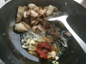 起锅热油,七分热下肉片,炼肉,感觉肉已经快焦了的时候(我爱吃快焦了的肉,不腻)放入郫县豆瓣酱、甜酱、大蒜翻炒。