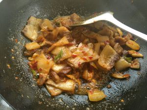 倒入肉片翻炒,加些酱油、盐。放水。大火收汁。