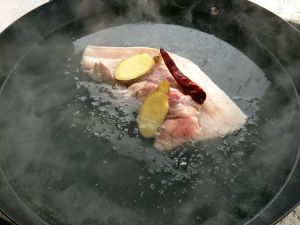 先把五花肉洗干净,放入锅中煮熟,并且在锅中放入料酒、姜片、葱条、生抽。